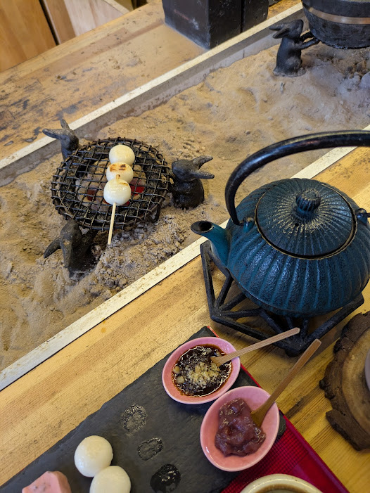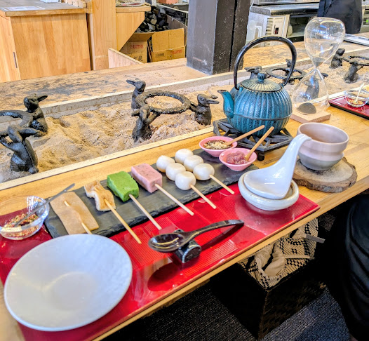 それぞれに串団子があり囲炉裏で炭火網で焼きながらいろんなあんこをつけたりして食べました!お団子焼くの楽しい!